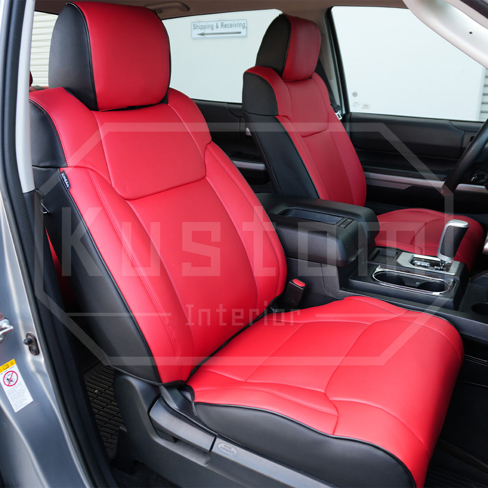 Upgrade your Toyota Tundra's seats with these luxurious, sporty leather seat covers from Kustom Interior™. With a 100% fitment guarantee, you can rest assured that these Toyota Tundra seat covers will work perfectly and look fantastic. The surface is waterproof and delightfully soft to the touch, protecting your factory upholstery leather seats from damage while also enhancing your comfort.